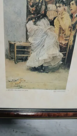 Reproducción del cuadro La Bulería del Museo de Bellas Artes de Sevilla. Una escena vibrante con una bailaora y público. - Marco de madera con detalles dorados. - Passepartout de tela crema.