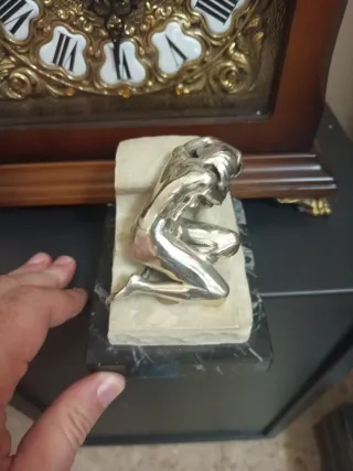 Escultura “Desconsol Barcelona” galvanizada en plata con base de mármol Descripción: Reproducción artística de la famosa escultura “Desconsol” de Barcelona. Figura metalizada galvanizada en plata sobre base de mármol negro y piedra. Muy decorativa y en buen estado. Ideal para colección o decoración.