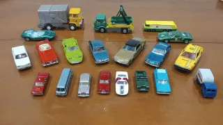 Se vende en lote o individual. Colección de coches metálicos antiguos de la marca Matchbox Lesney. Colección de coches metálicos vintage originales años 60-70 aprox. Incluye varias marcas clásicas de colección: Matchbox by Lesney (Made in England), Pilen (España), Inter-Cars, Solido y otros modelos europeos. Hay turismos, deportivos, autobuses, camiones y transporte de competición. Muchos conservan piezas móviles (puertas, capós, rampas, etc.). jugados pero bien conservados para su antigüedad. Ruedas completas y sin roturas graves. No son reproducciones modernas. Proceden de colección familiar guardada durante años. Precio nego