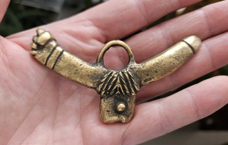 Dos colgantes con forma de falus, elaborados en bronce. Tienen un diseño detallado y un asa para poder colgarlos. Reproducciones - Cantidad: 2 unidades.