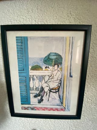 En 1992 el MOMA realizó la mayor exposición que se había hecho nunca de Matisse, esta reproducción de la obra ‘mujer con parasol en balcon’ se adquirió ese año en el Museo de Arte Moderna de Nueva York Esta obra fue pintada por el artista francés Henri Matisse en 1919. La pintura original es un óleo sobre lienzo y se enmarca dentro del estilo postimpresionista. Representa a una mujer sentada en un balcón con un parasol verde, destacando el uso magistral del color por parte de Matisse. La obra se considera un ejemplo de la habilidad de Matisse para crear escenas con una atmósfera contenida y meditativa.
