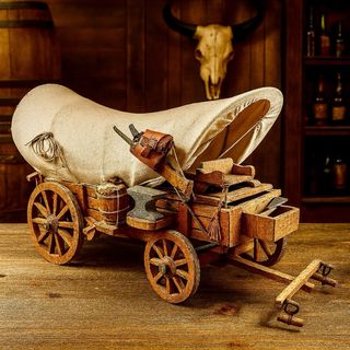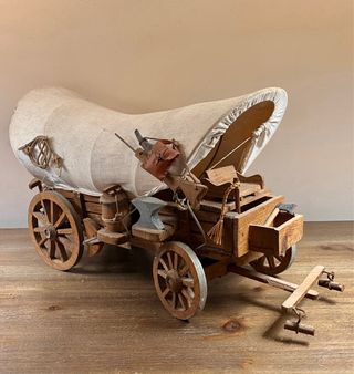 1. Espectacular Carreta pionera del Oeste hecha a mano en madera, con lona de algodón y múltiples accesorios: sacos, barril, herramientas, rifle y caja de carga. Reproducción artesanal de una covered wagon del siglo XIX. Buen tamaño (39×22 cm) y gran nivel de detalle en ruedas, estructura y acabados. 2. Elefante africano fabricado en lo que parece madera cubierta de cuero oscuro. Presenta una pátina antigua magnífica, con ojos de cristal y conservando ambos cuernos. Al parecer sufrió varias restauraciones en trompa (conserva restos del material urilizado) y en algunas patas, habiendo perdido parte de ambas orejas
