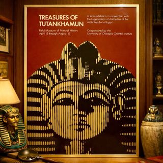 Cartel original de la exposición internacional “Treasures of Tutankhamun”, organizada por el Field Museum of Natural History (Chicago) junto a las autoridades egipcias y el Oriental Institute en 1977. Impresión offset profesional con tinta metálica dorada original aplicada selectivamente en la máscara (no imitación). Gran formato institucional, no reproducción moderna. Enmarcado. Medidas: 125 × 87 cm. Muy buen estado con leves marcas en el marco. ENVÍO POR AGENCIA POR SU GRAN TAMAÑO NO INCLUIDO. La primera imagen es una recreación digital y puede tener variaciones. Ver los detalles de la pieza en venta en las fotos siguientes.