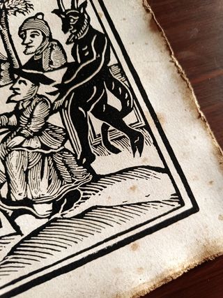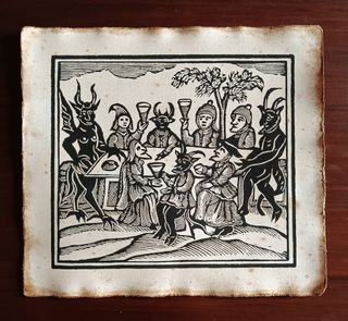 Reproducción de un grabado del siglo XVIII que muestra un banquete de brujas y demonios, impresa en papel de buena calidad envejecido a mano para simular un aspecto antiguo. Curiosidades, rarezas, coleccionismo, brujería, antiguo, oscuro, print, vintage
