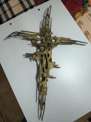 Crucifijo artístico de gran tamaño y peso, realizado íntegramente en metal fundido macizo, con un diseño expresionista poco común y acabado envejecido original. No es una reproducción moderna ni una pieza ligera: se trata de una obra decorativa sólida, con carácter y presencia, pensada para destacar como elemento central de pared. 📏 Medidas 60 *43 cms Peso aprox.: 1,45 kg Metal fundido macizo Cristo en tono dorado envejecido Cruz calada en metal patinado oscuro Trasera completamente metálica (no hueca) Pieza de colección. Pátina y marcas que refuerzan su autenticidad vintage. Ideal para hogares con carácter, capillas, dormitorios..