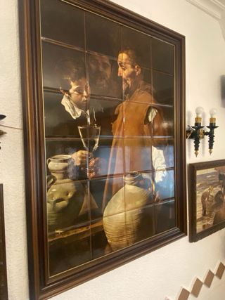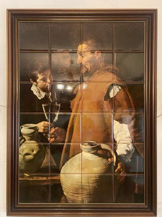 Reproducción del famoso cuadro El aguador de Sevilla de Velázquez. - Obra maestra del arte español. - Representación detallada de la escena. - Imitación a azulejo, técnica de trabajo minuciosa. Ancho 112 cm. Alto 154 cm. Fondo 6 cm.