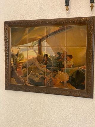 Reproducción de “Pescadores Valencianos” de Joaquín Sorolla Bastida. - Pareja de cuadros del pintor valenciano, realizados con una técnica que imita al azulejo. - Marco de madera tallada. - Se venden los dos juntos, precio 120€ cada uno. Ancho 82 cm. Alto 65 cm. Fondo 5 cm.