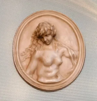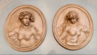 Dos relieves de estilo neoclásico, realizados en marmolina. Reproducción de figuras femeninas del escultor Clodion. Cada relieve mide 18 cm de alto y 15'5 cm de ancho.