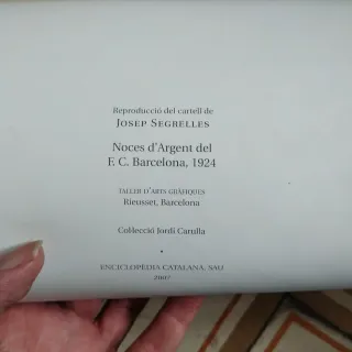 Reproducción Cartel conmemorativo del F.C. Barcelona, celebrando Noces d'argent los años 1899-1924. - Ilustración de una figura femenina con elementos del club. - Incluye detalles de eventos como el III Challenge Pere Praf. - Firmado por RIEUSSET y BARNA.