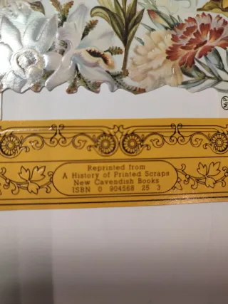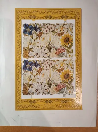 Reproducción de lámina con motivos florales, inspirada en cromos antiguos. - Diseño detallado con diversas flores y hojas. - Colores vibrantes y estilo clásico. - El cromo tiene un pequeño relieve. -El tamaño de la lámina es de 15 × 23 cm.