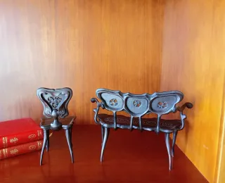 Reproducción en miniatura a escala 1/6 de las silla y el banco diseñados por Antoni Gaudí para el despacho de Casa Calvet, Barcelona 1902. Se trata del pack 1 banco y 1 silla Flores. Están hechos artesanalmente en madera de poliandro y son una preciosidad. El asiento de la silla mide 8cm, el fondo 6cm y de altura 16 cm. El asiento del banco, mide 21 cm. Se entregan nuevos con su folleto y caja original. Se hacen envíos. Conjunto de miniaturas de banco y silla con un diseño inspirado en el estilo Gaudí. - Banco con respaldo ornamentado. - Silla individual a juego. - Patas curvas y detalladas.
