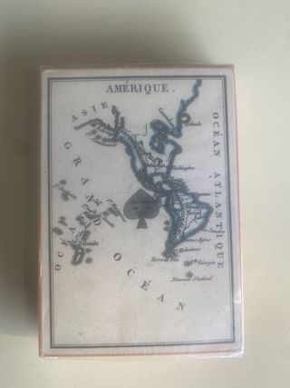 Reproducción de Baraja de cartas con un diseño de mapa antiguo de las 4 partes del mundo. - Ilustración de América, Asia, Groenlandia y Oceanía. - Incluye detalles geográficos y nombres de lugares históricos. - Diseño inspirado en la cartografía antigua.