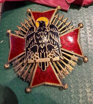 Placa de la Orden de Cisneros. Pieza auténtica, metálica, con águila esmaltada en negro, cruz esmaltada en rojo y rayos dorados calados. Fabricación antigua y de gran calidad, correspondiente a condecoración de alta distinción. Conservación muy buena, para su antigüedad. Muy buscada por coleccionistas de militaria y condecoraciones españolas. No es reproducción.