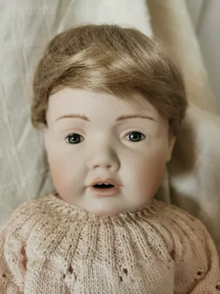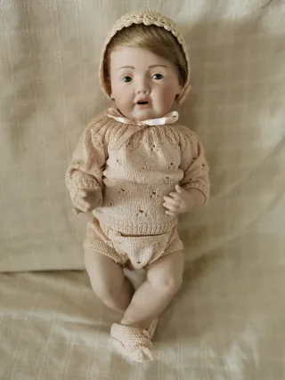 Preciosa muñeca bebé antigua de reproducción alemana, Simon and Halbig, totalmente de porcelana hecha artesanalmente y pintada a mano, articulada. Está nueva. Viene con un encantador conjunto de punto (vestido, gorro y patucos). La peluca se quita o se coloca opcionalmente. Longitud aproximada 45 cm - Conjunto de punto rosa. - Gorrito a juego. - Detalle de lazo en el cuello.