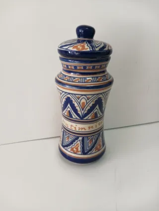 Tarro de farmacia de reproducción con un diseño decorativo. - Motivos azules y anaranjados. - Inscripción Antimnium en la parte central. 16 cm alto Duralex Vereco Elsadur Arcopal Arcoroc Opalina Vintage Porcelana Antiguo Colección Años 70 80 Vajilla Platos Retro Cerámica Loza Cristal vidrio