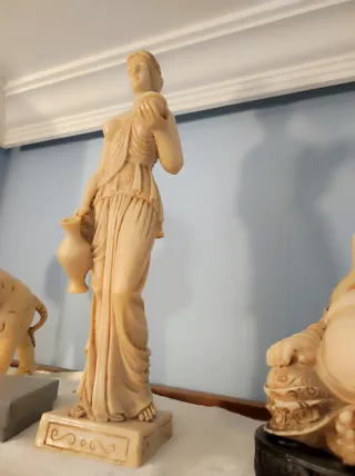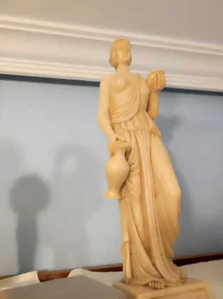 Estatua de estilo clásico que representa a Hebe, la diosa de la juventud, portando un jarrón. - Figura detallada en material similar al marfil. - Base decorada con motivos ornamentales. réplica de la escultura de Hebe, la diosa griega de la juventud. En la mitología griega, Hebe es la hija de Zeus y Hera. Su función principal era servir néctar y ambrosía a los dioses en el Monte Olimpo, de ahí la jarra y la copa que porta en la escultura. La escultura original más famosa fue creada por Antonio Canova a principios del XIX. La pieza de la imagen parece ser una reproducción en material como alabastro o marmolina. (IA). Hago envíos.