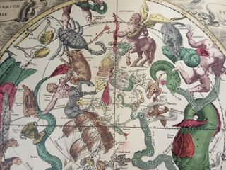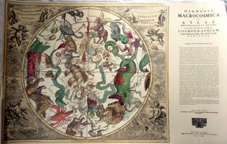 Preciosa lámina antigua, titulada Harmonia Macrocósmica, representación detallada de las constelaciones. Años 60-70. Publicidad de laboratorio farmacéutico Hoechst Ibérica S.A, reproduccion de mapa estelar antiguo de 1708. Buena calidad, papel grueso. Total 80x60 ctms, interior 70x45 ctms - Mapa estelar del hemisferio norte de la antigua bóveda celeste. - Incluye figuras que simbolizan los nombres de las constelaciones. - Publicada en Atlas Universalis et Novus, Totius Universi Creati Cosmographiam Generalem, et Novam Exhibens. - Editada por Andreas Cellarius. - Impresa en Ámsterdam por Gerard Valk & Petrum Schenk en 1708.