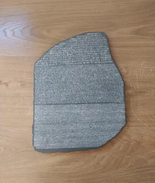 Réplica reproducción detallada de la Piedra Rosetta, un artefacto histórico de gran importancia conservado en British Museum. Texto en gerogífico egipcio, demótico y griego antiguo. Egipto, Grecia, arqueología, egiptología, lingüística, historia, arte, conservación y coleccionismo.