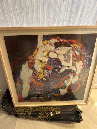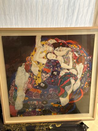 Reproducción de la obra La Virgen de Gustav Klimt, enmarcada. - Obra icónica del Art Nouveau. - Colores vibrantes y detalles dorados característicos. - Enmarcado en madera de halla 76cm x 76 cm