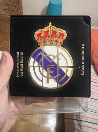 Reproducción oficial del escudo del Real Madrid, con un acabado bañado en oro de 24 quilates. Un artículo oficial del club. Solo existen 100.000 ejemplares. Ideal para coleccionistas