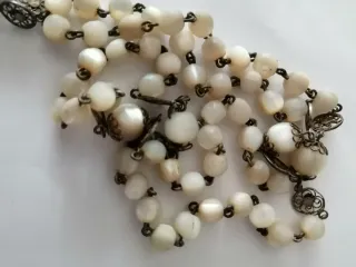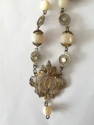 Antiguo rosario original en plata dorada (Vermeil) y cuentas de nácar natural con tonos irisdiscentes y delicada filigrana artesanal. - Pieza de finales del S. XIX principios del XX. Conserva su pátina original y desgaste coherente a su antigüedad, lo que confirma que no es una reproduccion moderna. Le falta la Cruz, ideal para restaurar o sustitución por una cruz antigua.