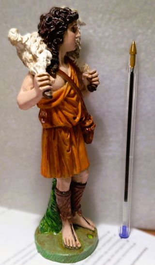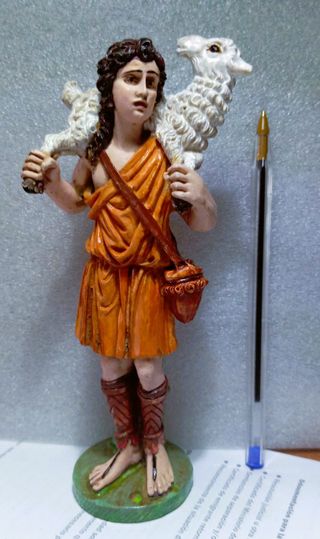 Reproducción policromada de El Buen Pastor del siglo IV conservado hoy en los Museos Vaticanos en mármol blanco. La figura del pastor ha sido, una de las imágenes más recurrentes en relación a la figura de Cristo “Buen Pastor” (Jn 10,11) y la parábola de la oveja perdida (Mt 18,12-14; Lc 15,4-7): la estatuilla del Museo Pío Cristiano, con el espléndido rostro “apolíneo” característico de la iconografía más antigua de Cristo, para representar a Cristo como guía, protector y salvador de su pueblo. y un significado aún más comprometido: no solo cuida a su rebaño, sino que da la vida por él.