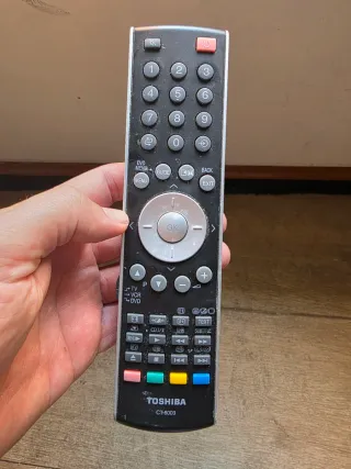 Mando a distancia Toshiba CT-8003. - Botones numéricos del 0 al 9. - Botones de navegación (arriba, abajo, izquierda, derecha, OK). - Botones de función (DVD, MENU, GUIDE, BACK, EXIT). - Botones de reproducción (Play, Pause, Stop, Rewind, Fast Forward). - Botones de colores (rojo, verde, amarillo, azul). - Logo de Toshiba.
