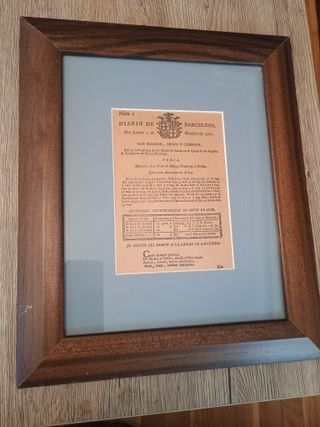 Reproducción del Diario de Barcelona del 1 de Octubre de 1792. Un documento histórico de gran interés. sÓLO LA PORTADA Enmarcado y en perfecto estado. El documento mide aprox medio din A4. - Edición facsímil. - Fecha: 1 de Octubre de 1792. - Incluye noticias de la época y efemérides.