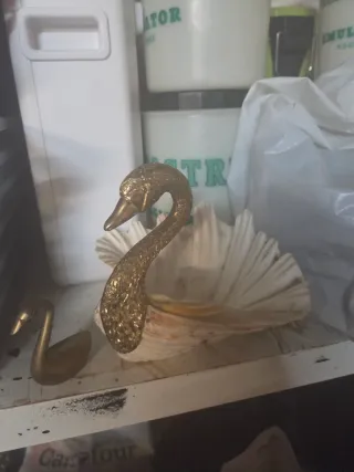 Años 60–70. Cisne con cabeza y cuello metálicos y cuerpo realizado con concha natural. Ideal como vaciabolsillos o decoración retro. Desgaste acorde a la antigüedad. Pieza original, no reproducción.