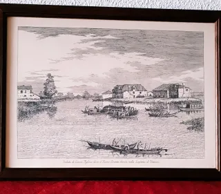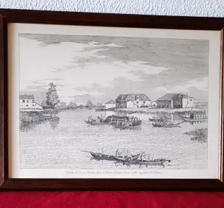 Reproducción años 60, de dibujo a tinta, de un paisaje veneciano en Lizza Fusina: Pesca artesanal en la desembocadura del Río Brenta en la Laguna de Venecia. Paisaje fluvial muy detallado con barcas típicas, góndolas, y edificios. Tiene una inscripción:" Veduta di Lizza Fusina dove il Fiume Brenta sbocca nella Laguna di Venezia". - Marco de madera. - Impresión tinta sobre cartulina-pergamino.