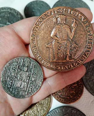 Conjunto de reproducciones de 12 monedas y sellos medievales. - 12 Piezas con grabados detallados realizadas en metal replicando monedas y sellos medievales. - Variedad de diseños y tamaños.