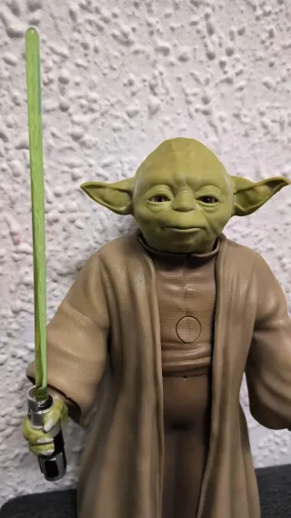 Figura del personaje Yoda de Star Wars, de la marca Disney. - Excelente reproducción detallada del personaje - Sonidos y frases de la película que se reproducen al pulsar un botón - Movimientos realistas de la cabeza, los ojos y la boca al hablar - Responde a órdenes de voz - Espada láser con luz y sonidos - Producto oficial Disney. - Sin caja. - Tamaño 26 × 18 × 6 cm aprox. - Siempre ha estado en vitrina.