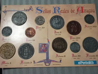 Colección de sellos reales de Aragón. - Reproducciones de sellos históricos. - Incluye nombres y fechas de los reyes: Jaime I, Pedro III, Alfonso III, Jaime II, Pedro IV, Alfonso V, Juan II, Fernando II, Martín I. - Presentado en un soporte temático.
