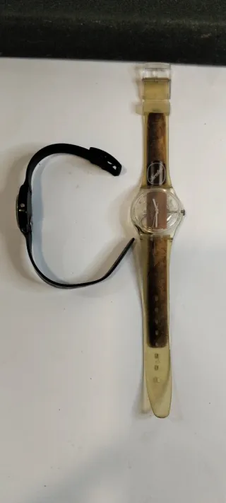 Lote de dos relojes Swatch.son los de las fotos no sé an manipulado en los 2 la única prueba es mover las agujas y van bien en los 2 para más detalles sin compromiso - Un reloj Swatch negro con esfera negra y detalles en rojo y amarillo. - Un reloj Swatch transparente con correa de plástico y un diseño interior que simula un puro