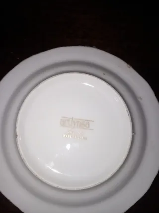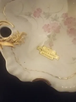 Elegante plato de porcelana pintado a mano con detalles en oro. - Diseño floral delicado. - Borde con acabado dorado. - Marca: Decorfinsa.
