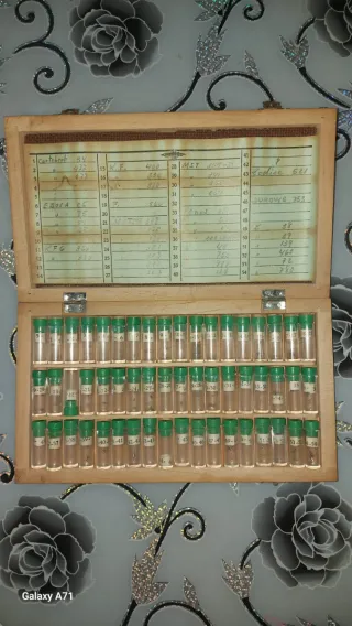 Caja de madera con herramientas y viales para relojería. - Contiene viales con etiquetas numeradas y escritas. - Incluye un listado con nombres y números.