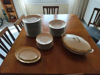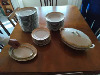 Conjunto de vajilla antigua de la marca Santa Clara. Piezas con un elegante borde dorado. - Vajilla de porcelana. - Diseño clásico con detalles dorados. 1 sopera 12 platos hondos 9 platos postres 19 platos llanos 1 bandeja grande deteriorada 1 bandeja mediana 1 bandeja pequeña