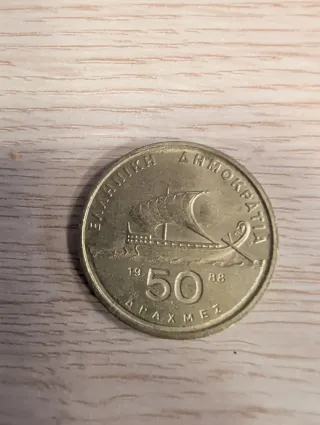 Moneda conmemorativa de Grecia de 50 dracmas del año 1988. Presenta el busto de Homero. - Anverso: Busto de Homero. - Reverso: Inscripción 50 ΔΡΑΧΜΑΙ y ΕΛΛΗΝΙΚΗ ΔΗΜΟΚΡΑΤΙΑ.