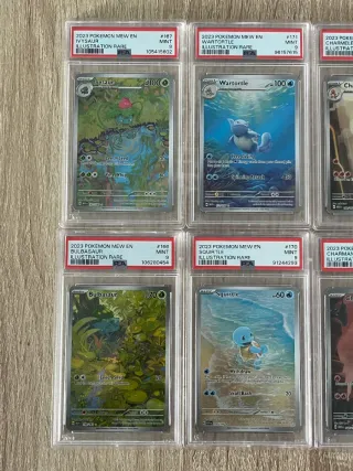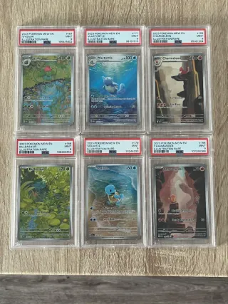 Conjunto de cartas Pokémon de la colección 151, todas con calificación PSA 9. Están en inglés. Precio negociable. Mas barato que en cardmarket y todas juntas. Acepto material sellado de pokemon a cambio. - Ivysaur #167 - Wartortle #171 - Charmeleon #169 - Bulbasaur #166 - Squirtle #170 - Charmander #168