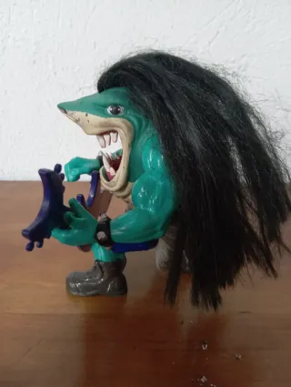 Figura de acción de Street Sharks, un personaje con una guitarra. - Figura de color verde con detalles en azul y negro. - Incluye una guitarra azul con forma de tiburón. Tiene roto el egache de detrás solo