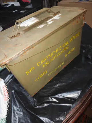 Caja de munición metálica de color verde militar. - Asa superior para facilitar el transporte. - Cierre metálico.