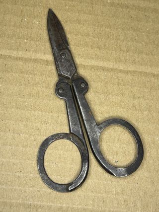 Tijeras antiguas con un diseño clásico y robusto, plegables. - Fabricadas en metal. - Mecanismo de unión visible.