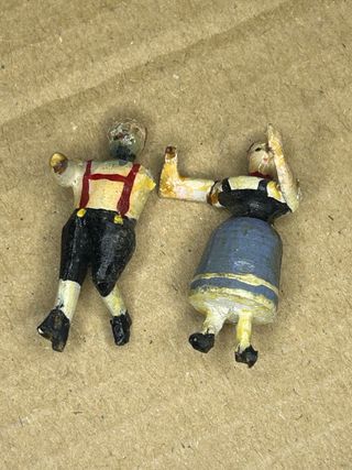 Conjunto de dos figuras decorativas representando una pareja bailando. - Figura masculina con pantalones negros, tirantes rojos y camisa amarilla. - Figura femenina con vestido azul y negro. Pertenecían a un reloj antiguo, hechas a mano con evidentes desgaste y al hombre le falta un brazo.