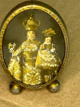 Marco ovalado con una imagen religiosa detallada. Presenta figuras coronadas y vestimentas ornamentadas. Virgen de los Remedios - Marco metálico con base. - Imagen con detalles dorados. Alto 5cm. Ancho 3,5 cm.