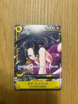 Carta de Boa Hancock, edición promocional P-115. - Personaje: Boa Hancock. - Tipo: Character. - Coste: 6. - Poder: 7000. - Atributo: Especial. - Clan: Shichibukai / Pirates of the Sea. - Efecto de aparición: Otorga hasta 1 Don!! a tu Líder o un personaje. - Efecto de disparo: Permite desplegar hasta 1 carta de disparo con poder 5000 o menos del atributo Amarillo desde tu mano.