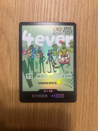 Tarjeta de One Piece Don!! del evento Gre4n Boyz para el OP Day 24. - Diseño especial 4ever. - Incluye los personajes 92 HIDE SOH. - Con el logo GRE4N ΒΟΥΖΟ. - Indica 我方的回合 +1000.