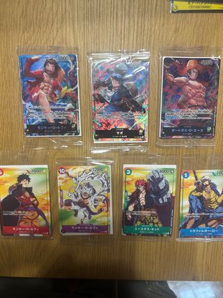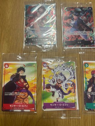 Colección de cartas promocionales de One Piece, selladas y en perfecto estado. - Incluye cartas de personajes populares como Monkey D. Luffy, Sabo, Portgas D. Ace, Eustass Kid y Trafalgar Law. - Cartas con arte exclusivo y detalles brillantes. - Ideales para coleccionistas y fans del anime.