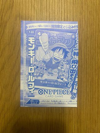 Carta promocional de Monkey D. Luffy, número P-033, para el juego de cartas One Piece. - Incluida como extra en la revista Weekly Shonen Jump. - Diseño especial con arte de Monkey D. Luffy. - Ideal para coleccionistas y jugadores del juego de cartas One Piece.