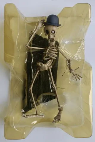 Figura de Skeleton Band Leader de la película La novia cadáver de Tim Burton (McFarlane toys, 2006, serie 2). El blíster está abierto por su parte trasera pero la figura está como nueva ya que ha permanecido en el blíster desde 2006 que fue comprada. El plástico del blíster ha oscurecido por el paso de todos estos años.