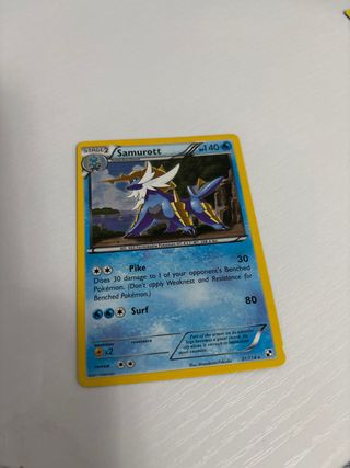 Carta Pokémon de Samurott del año 2011. - Etapa 2. - HP 140. - Ataque Pike: 30 de daño. - Ataque Surf: 80 de daño. - Debilidad x2. - Resistencia. - Coste de retirada: 2. - Ilustrador: Masakazu Fukuda. - Número de carta: 31/114.